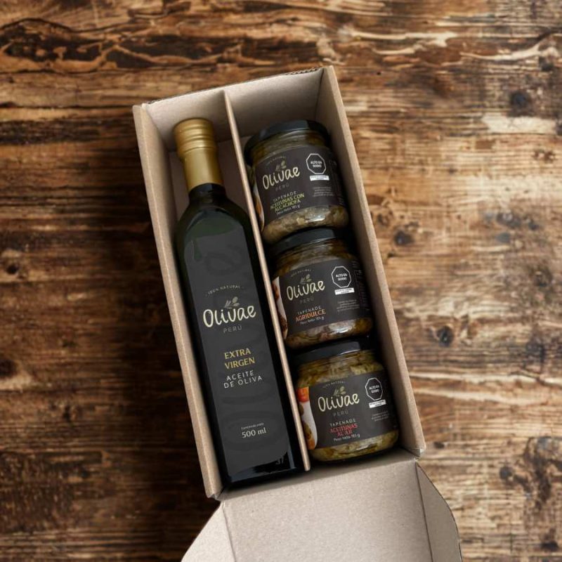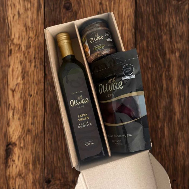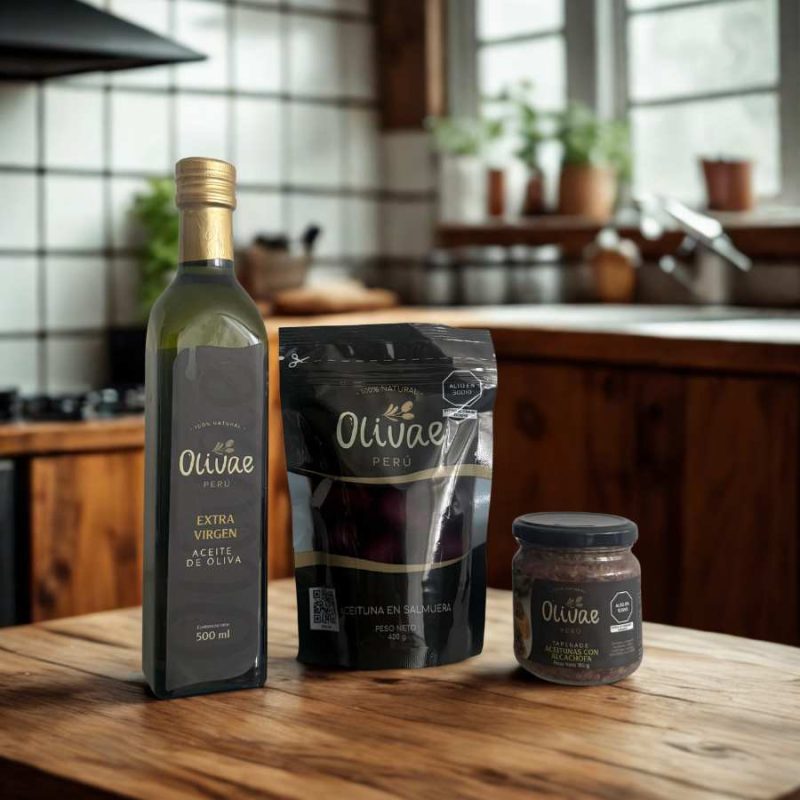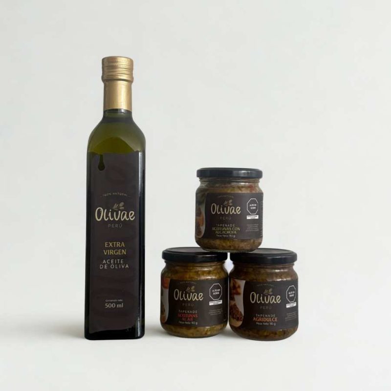 Pack Mix Olivae Perú Incluye 1 botella de aceite de oliva extra virgen Tradicional de 500 ml, aceitunas a elección de